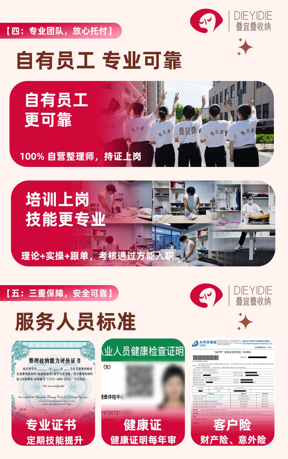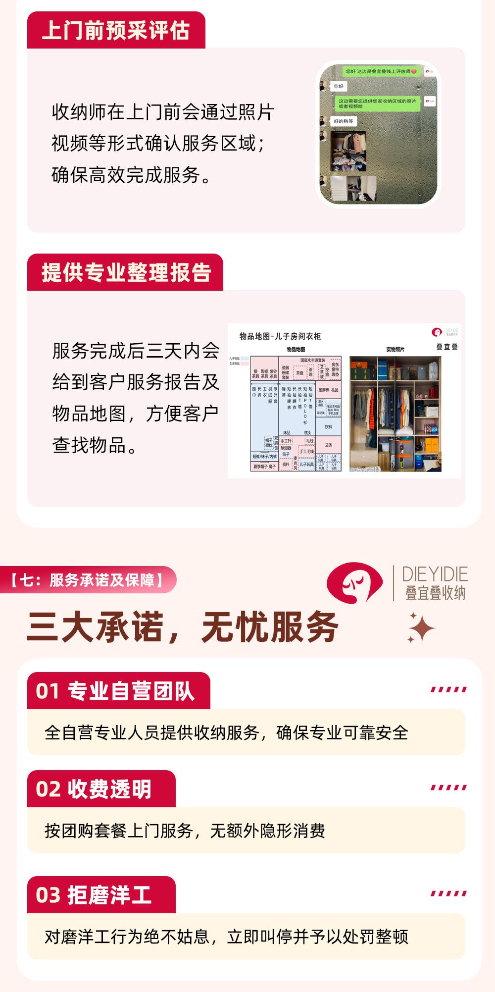 叠宜叠打造宜人生活,整叠自由人生! 11年资深整理收纳经验,档案化自管理5400+整理师,直营非加盟400+门店。 服务内容:区域整理、全屋整理,搬家前后打包等专业上门整理收纳服务,叠宜叠整理收纳,解决您的房屋整理收纳烦恼。 【店铺服务描述】: 1、全屋整理:空间规划、衣橱、衣帽间、餐厅、客厅、厨房、儿童房、书柜、玄关、杂物间、阳台等的整理收纳; 2、办公整理:办公室、展厅等整理收纳; 【整理服务流程】: 1、整理师一对一与客户沟通、规划,按客户的空间状态、生活习惯,规划可行的收纳整理方案; 2、对储物空间清空、简单清洁、协助客户对物品进行断舍离、筛选分类; 3、根据整理方案,进行科学收纳整理,做到美观、整齐,使用方便; 4、收纳整理完成后,对物品的摆放位置进行贴标签,与客户进行沟通、说明; 5、邀请客户对收纳工作进行评价、验收; 6、收纳结束后对客户指导收纳整理简单的日常维护方法; 7、具体上门时间需与商家沟通确认后为准,以确保服务质量。 【服务保障】:专业 高效 健康 安全 1、收纳师整理师都经专业培训、严格实习考核、合格后上岗; 2、快速匹配,高效服务; 3、身体健康; 4、信用良好; 【整理师培养及管理】 1、统一培训: 全屋整理收纳技巧网课+3天职业从业课堂面授+1天导师带领入户真实客户家实景实操+至少1年的导师责任制带领持续入户服务质量审核+入驻平台前的岗前训练。 2、高标准甄选: 整理师6个月以上从业期持续上门服务及专业性考察,整理师500小时以上入户服务经验。 3、档案化垂直管理: 每期培训课,培训课程结束至入驻平台期间,每位学习者,专属的个人档案总部建档更新; 每位服务者,培训课程结束至入驻平台期间,每上门一户,专有的上门报告提交总部审定。 此团单对应2位整理师3小时 上门整理需提前24小时预约,期待小主的光临哦! 单次消费最多使用1张团购券 预约须提前24小时,具体上门服务时间会由客服和您二次确认 每天23:00前可预约 一个地址一次服务只能使用一张团购券