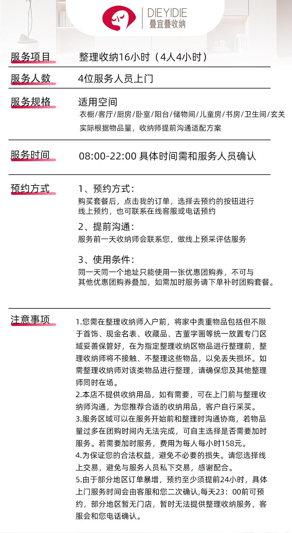 叠宜叠打造宜人生活,整叠自由人生! 11年资深整理收纳经验,档案化自管理5400+整理师,直营非加盟400+门店。 服务内容:区域整理、全屋整理,搬家前后打包等专业上门整理收纳服务,叠宜叠整理收纳,解决您的房屋整理收纳烦恼。 【店铺服务描述】: 1、全屋整理:空间规划、衣橱、衣帽间、餐厅、客厅、厨房、儿童房、书柜、玄关、杂物间、阳台等的整理收纳; 2、办公整理:办公室、展厅等整理收纳; 【整理服务流程】: 1、整理师一对一与客户沟通、规划,按客户的空间状态、生活习惯,规划可行的收纳整理方案; 2、对储物空间清空、简单清洁、协助客户对物品进行断舍离、筛选分类; 3、根据整理方案,进行科学收纳整理,做到美观、整齐,使用方便; 4、收纳整理完成后,对物品的摆放位置进行贴标签,与客户进行沟通、说明; 5、邀请客户对收纳工作进行评价、验收; 6、收纳结束后对客户指导收纳整理简单的日常维护方法; 7、具体上门时间需与商家沟通确认后为准,以确保服务质量。 【服务保障】:专业 高效 健康 安全 1、收纳师整理师都经专业培训、严格实习考核、合格后上岗; 2、快速匹配,高效服务; 3、身体健康; 4、信用良好; 【整理师培养及管理】 1、统一培训: 全屋整理收纳技巧网课+3天职业从业课堂面授+1天导师带领入户真实客户家实景实操+至少1年的导师责任制带领持续入户服务质量审核+入驻平台前的岗前训练。 2、高标准甄选: 整理师6个月以上从业期持续上门服务及专业性考察,整理师500小时以上入户服务经验。 3、档案化垂直管理: 每期培训课,培训课程结束至入驻平台期间,每位学习者,专属的个人档案总部建档更新; 每位服务者,培训课程结束至入驻平台期间,每上门一户,专有的上门报告提交总部审定。 此团单对应4位整理师4小时 上门整理需提前24小时预约,期待小主的光临哦! 单次消费最多使用1张团购券 预约须提前24小时,具体上门服务时间会由客服和您二次确认 每天23:00前可预约 一个地址一次服务只能使用一张团购券